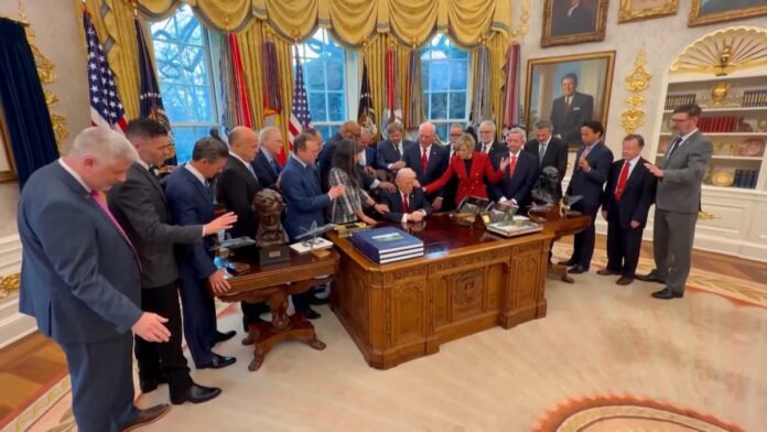 He ahí un grupo de personas apelotonadas en forma de enjambre alrededor de esa especie de abeja reina religiosa. He ahí por tanto un enjambre de cabezas cada una de las cuales reúne un enjambre de 80.000 millones de neuronas. He ahí también un enjambre de manos que forman una cadena hasta alcanzar el cuerpo del líder sobre cuyos hombros recae la responsabilidad de matar con alegría a quien se le ponga por delante. He ahí, en fin, un grupo de pastores evangélicos pidiendo a Dios que Trump lo haga bien, que bombardee bien, que secuestre bien, que propague bien el sufrimiento por doquier. Demasiadas personas, demasiadas cabezas, demasiadas neuronas, demasiadas manos para la búsqueda de un fin tan miserable. Nos preguntamos qué pensarán en el cielo los enjambres de ángeles, arcángeles, principados, potestades, virtudes, dominaciones, tronos, querubines y serafines de la jerarquía celestial reunidos en torno a Dios.