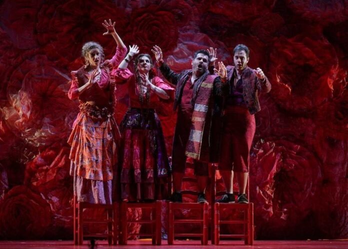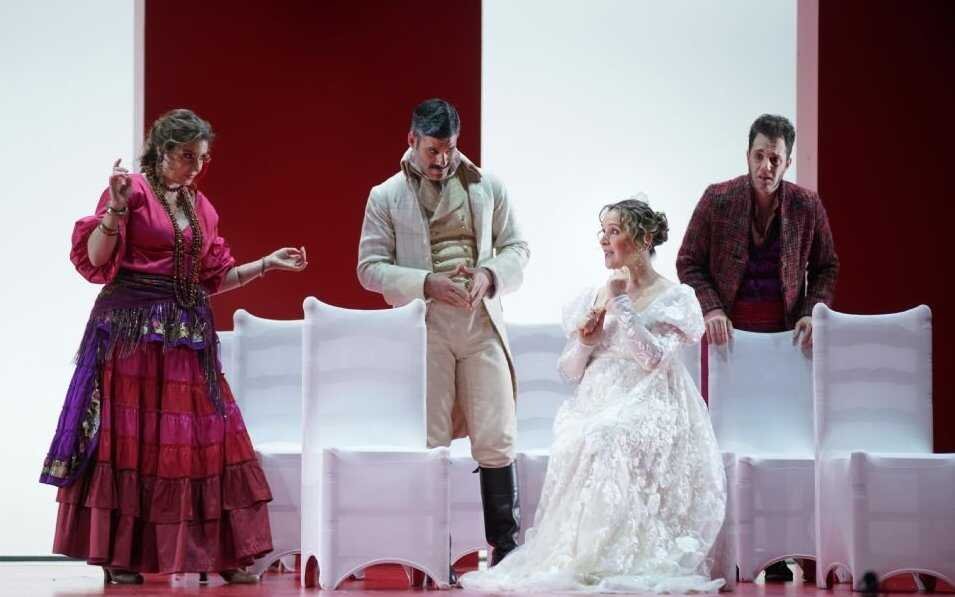 La producción de Emilio Sagi apuesta por la elegancia y la claridad narrativa. La escenografía de Daniel Bianco se articula en torno a un espacio sencillo, sobrio y funcional, presidido en el primer acto por un gran telón floral y apenas algunos elementos de mobiliario. Esa sencillez permite concentrar la atención en la acción dramática y, sobre todo, en la música. El resultado es un espectáculo ágil, luminoso y de ritmo constante, con momentos musicales de gran brillantez y una obertura de fuerza arrolladora que marca desde el inicio el tono festivo de la velada.