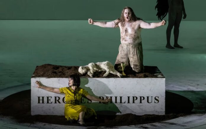 La producción, estrenada en La Scala en 2021 sin público y repuesta allí en 2023, propone una lectura psicoanalítica y ritualista que reescribe el drama de Oscar Wilde y Richard Strauss como una tragedia familiar de inspiración shakespeariana, cercana a Hamlet. El foco se desplaza hacia el fratricidio de Herodes Filipo a manos de su hermano usurpador, con Herodías como Gertrudis y un Jochanaan transformado en espectro paterno: voz subterránea que emerge de una cisterna convertida en tumba del padre con un túmulo/altar con su nombre para desenterrar la verdad reprimida del clan.