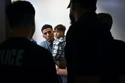 Yonquenide, inmigrante latino, lleva en brazos a su hijo Emmanuel en presencia de su esposa, Franyelis. Está a punto de ser detenido por miembros del ICE tras su citación ante el juez. Apenas le dejarán cinco minutos para despedirse.Carol Guzy (Zuma Press / Contacto)