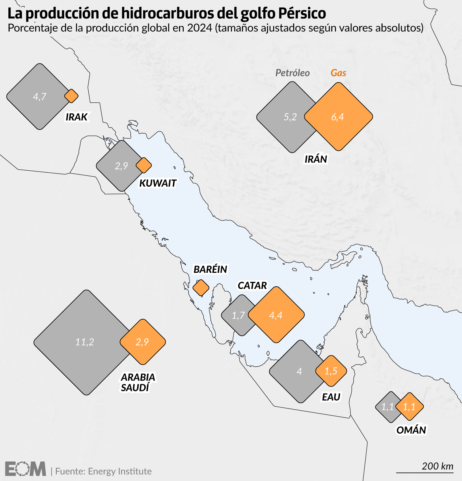 Los otros grandes afectados son los países productores del Golfo, que no ven salida a sus exportaciones salvo a través de dos oleoductos en Arabia Saudí y Emiratos Árabes Unidos. Kuwait y Catar exportan todo su petróleo por el estrecho, Irak el 97%, Arabia Saudí el 89% y Emiratos el 66%. A esto se le suman los ataques de Irán a sus infraestructuras energéticas: Catar ya ha perdido el 17% de su capacidad de producir gas natural licuado en los próximos cinco años. De alargarse el bloqueo, las petromonarquías de la región se verán obligadas a frenar su producción, ahondando en el desabastecimiento global y abriendo una crisis interna por problemas de abastecimiento de otros recursos clave para sus economías, desde alimentos hasta turistas.