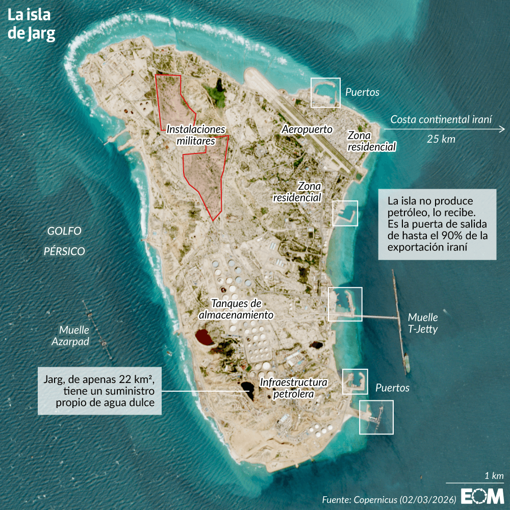 Por su parte, la alternativa de Jarg es más directa pero también más drástica. Al contrario que Abu Musa, la isla está lejos de Ormuz, en el norte del golfo Pérsico junto a la costa continental iraní. Su importancia reside en sus puertos: a través de ellos Teherán canaliza hasta el 90% de sus exportaciones petroleras.